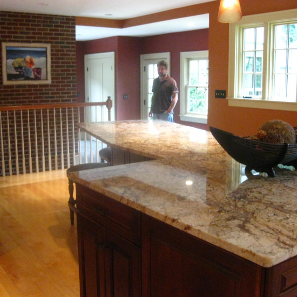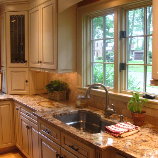 Project Information: This kitchen update includes new cabinets, counters, appliances, flooring, and windows. In addition, the stairs to the basement were opened up, and a new railing was added.